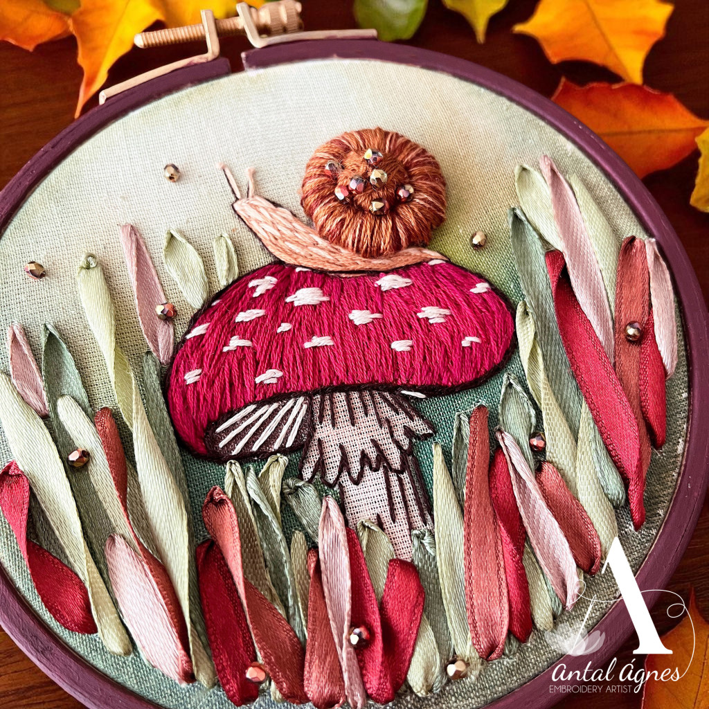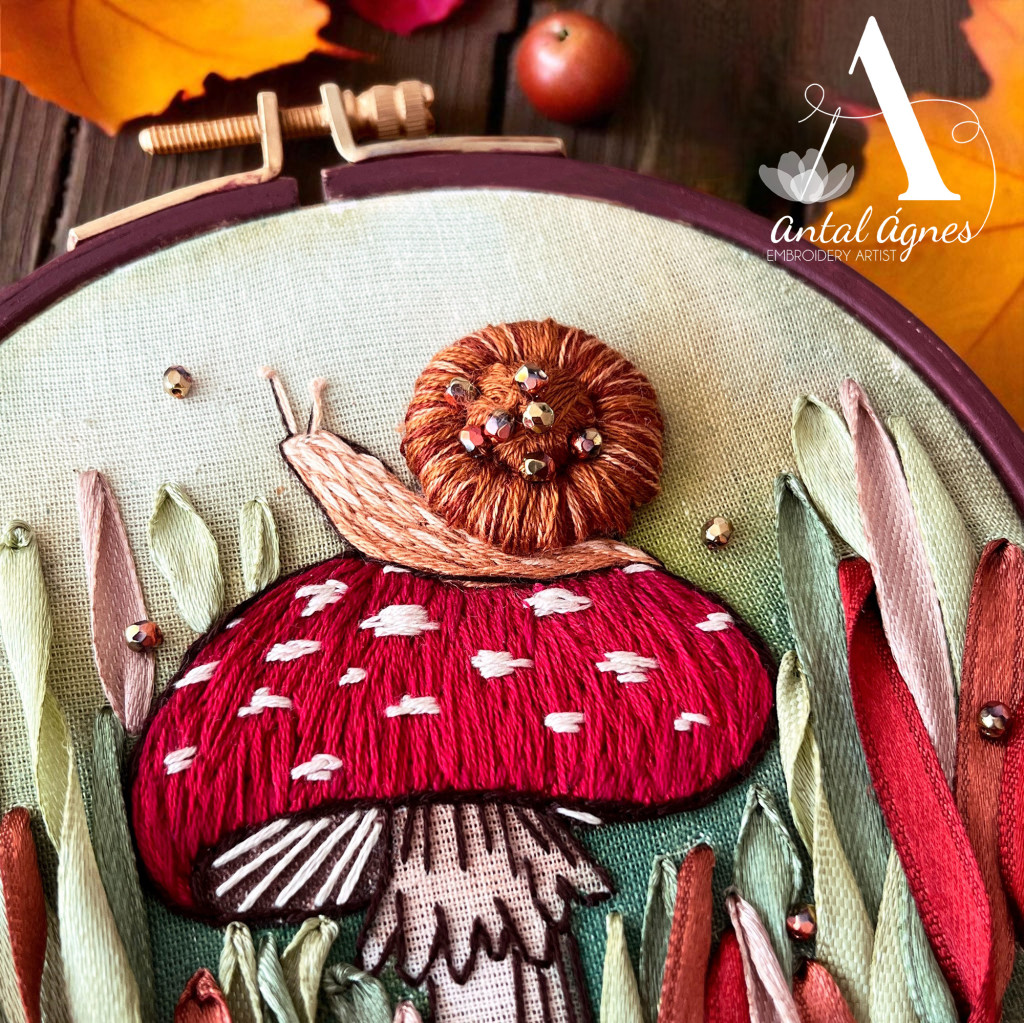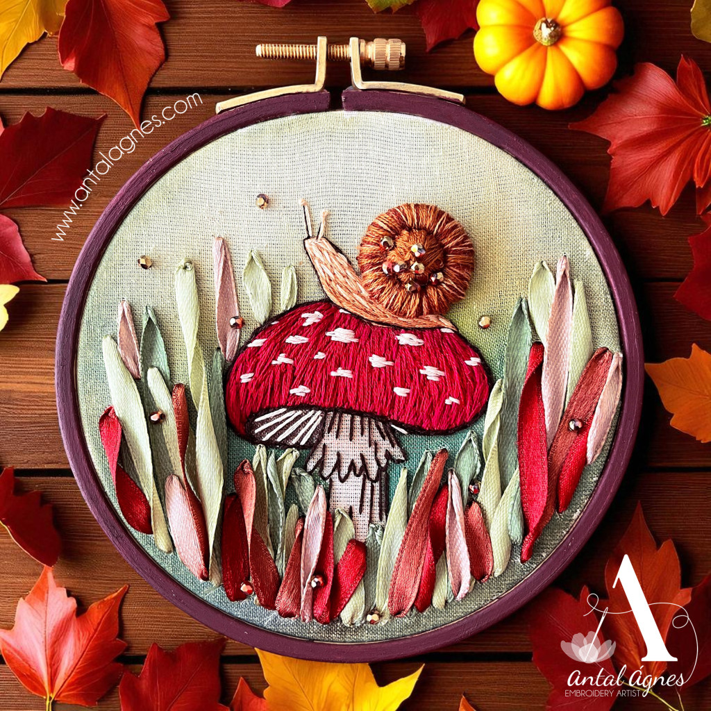 A hímzőkészlet segítségével Te magad is el tudod készíteni ezt a hangulatos őszi képet, melyben ötvözzük az akvarell festést, a modern hímzést és a szalaghímzést. A csiga házát 3D-re készítjük, így ki fog emelkedni a képből, melyett csodás gyöngyökkel is díszítünk.