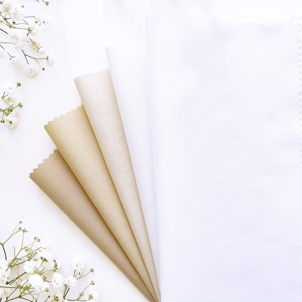 The 5-pack includes: 1 piece of white, 1 piece of bone, 1 piece of cream, 1 piece of champagne, and 1 piece of khaki fabric.