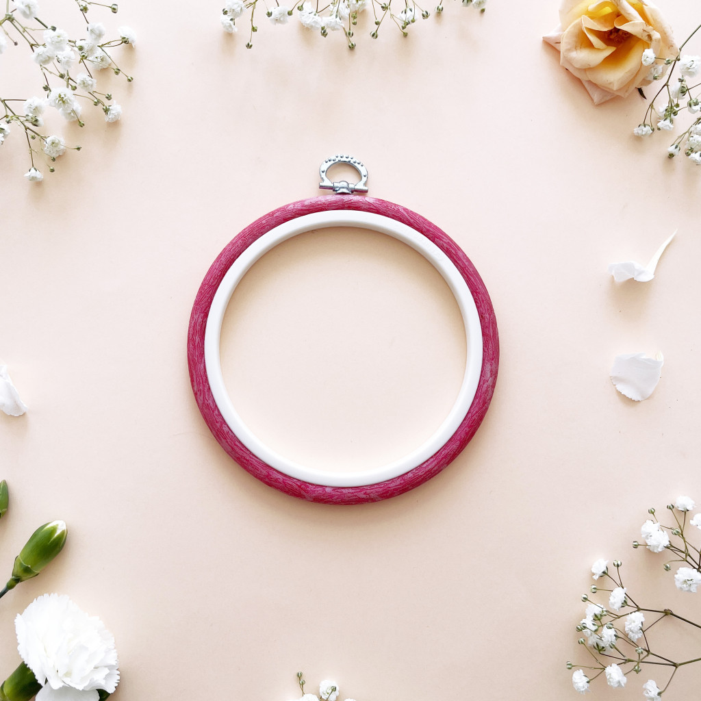 A round, flexible embroidery frame with a decorative hanger on top.