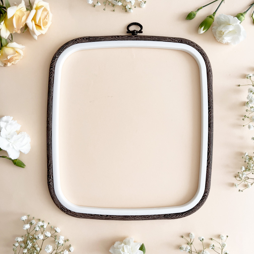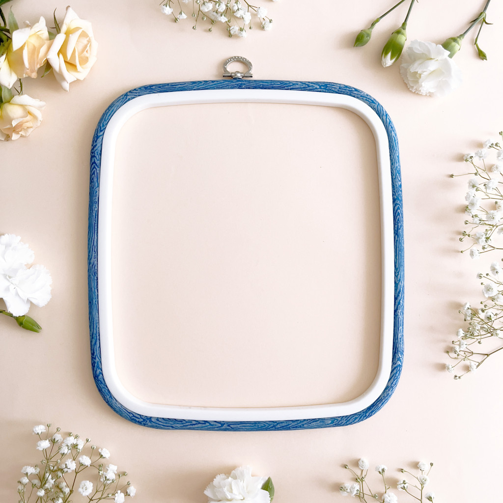 Square-shaped, flexible embroidery hoop in multicolor design.