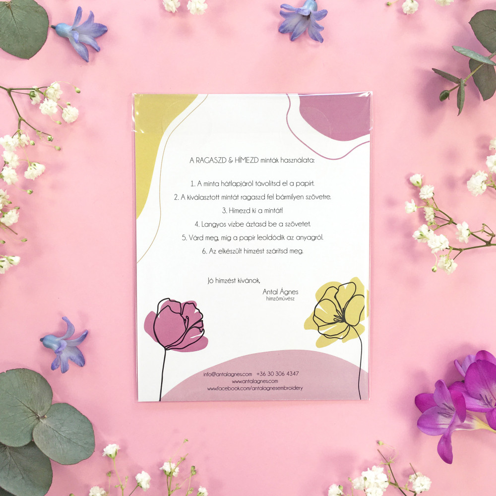 The package does not include an embroidery guide, so it is up to your creativity to decide which colors and stitch types to use. For different stitch types, check out my YouTube channel, and you can find the beautiful DMC color palettes in my webshop.