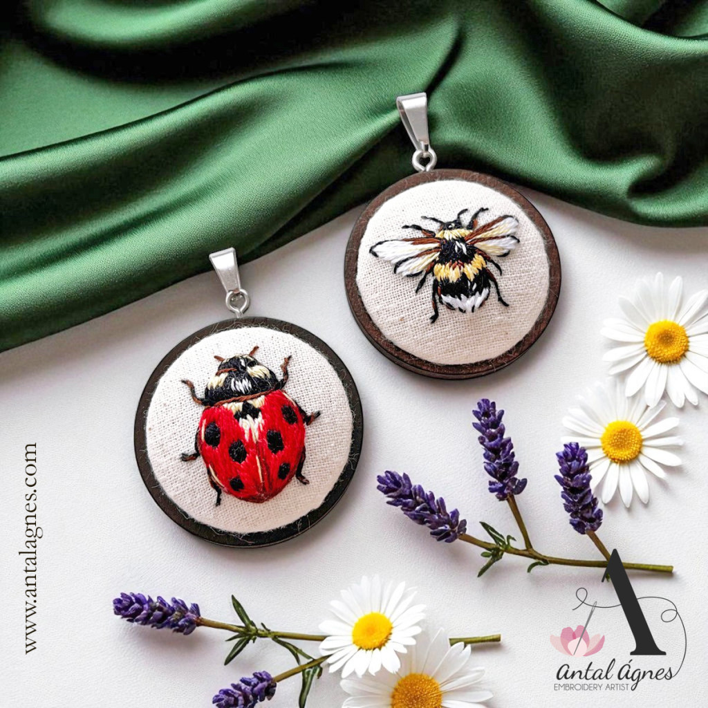 In the instructional video, I explain everything step by step, and we will embroider the two insects together. I’ll also show you how to stretch the fabric over the cabochon and how to turn the embroidery into a finished pendant.
