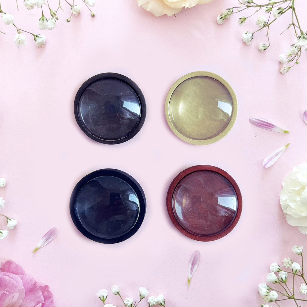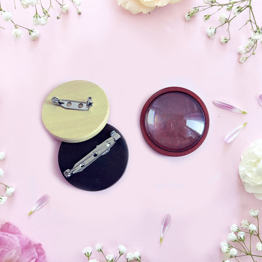 Fa kitűző alap + üveglencse brosskapoccsal ellátva, hogy könnyen magaddal vidd a kedvenc hímzésedet.
