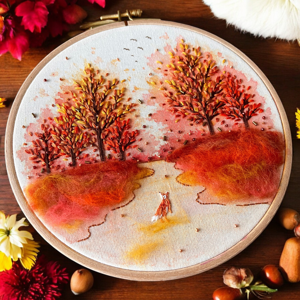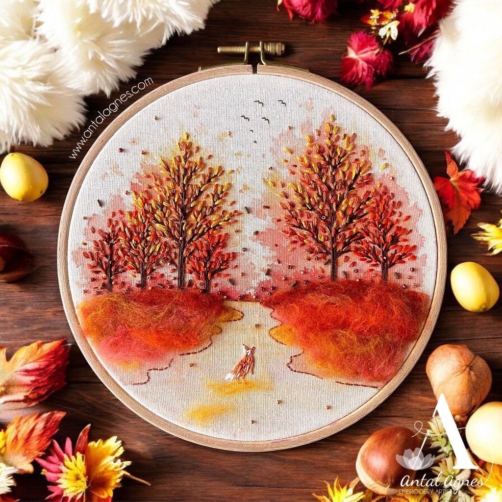 A "ŐSZI KERINGŐ" hímzőkészlet mintájával megnyomott anyag.